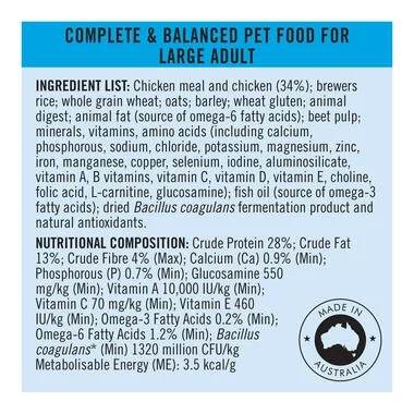โปรแพลน®สุนัข สำหรับสุนัขโตพันธุ์ใหญ่ สูตรไก่ ได้รับการคิดค้นสูตรอาหารให้มีคุณค่าสารอาหารตามมาตรฐานของ AAFCO (Association of American Feed Contrl Officials) ซึ่งเหมาะสมกับสุนัขโตเต็มวัย อายุ 2 ปีขึ้นไป เพื่อสุขภาพที่ดีเหมาะสมกับความต้องการของสุนัขโตเต็มวัย